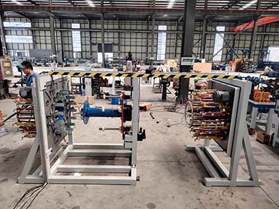 1.编织碳纤维和玻璃纤维。2.2套设备均带4锭缠绕 缠绕纱为碳纤和玻纤外放纱,纱线纸筒内径75mm、高度280mm 直径200mm 3.缠绕机的中心内孔做大于Ø120mm。4.为保证碳纤不打扭缠绕用被动形式放线带张力刹车。130复材专用 锭子。纱管65*210。5.缠绕机要有浸胶装置(沾胶加胶槽)。每套编织机带。一个胶桶,形状为方口深100mm、下面是漏斗状深100mm,底部出口加个100mm长度的圆管。胶桶带20mm翻直边,带个胶桶放置架。 6. 380V 三相 变频器用易能变频器,注:拨盘使用带轴承的。7.控制柜、电器为碳纤专用防爆柜,编织、缠绕速度控制为电位器,加数字显示 (有显示缠绕转速的表)8.配2套模芯固定装置(简易模芯固定架) 。9.带撑线圈 撑线圈外径小于编织轨道内圈100MM 高度可调。