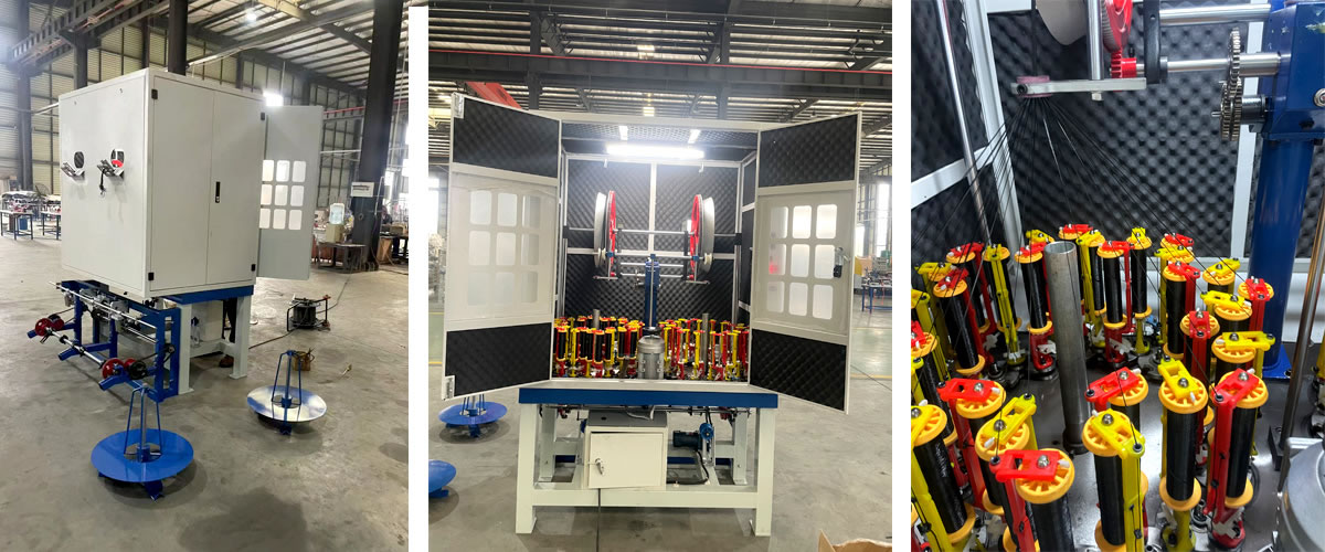带收卷带放线架 (配套两个500工字轮) 编织胶管 ,含收线放线中心芯管。电压380V,三相 变频器为易能。全封闭封闭罩。90弹锭 ,纱管尺寸47*142。可缠绕膜密封,挂线出厂。